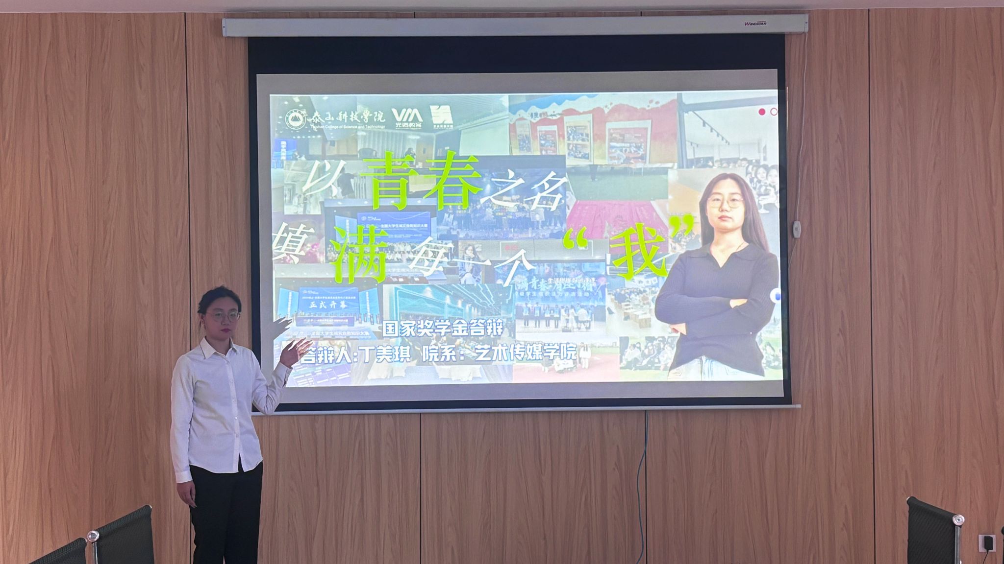 随后登场的答辩人丁美琪以《青春不设限,我正奔向“我”》为题,激情洋溢地讲述了自己的青春奋斗故事。她认为,青春是充满无限可能的,不应给自己的人生设限。在大学期间,她不仅在本专业领域深耕细作,取得优异的成绩,还积极探索多个领域,尝试跨学科学习与实践。她踊跃参与创新创业项目,组建团队研发艺术与科技融合的创意产品;投身校园文化活动,策划并组织了多场极具影响力的艺术展览和传媒活动;同时,她还热心公益,用艺术和传媒的力量为社会传递正能量。她以开放的心态拥抱每一次机遇与挑战,在不断尝试中找真正的自我,向着心中理想的“我”奋力奔跑。