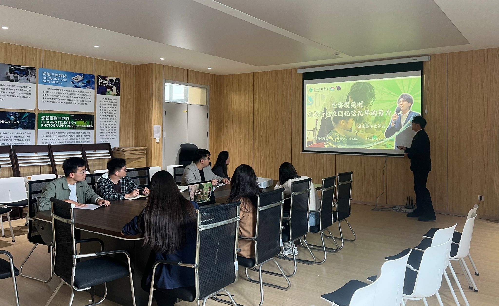 为公平、公正、公开选拔2024-2025 学年国家奖学金推荐人选,激励全院学生勤奋向学、全面发展,9月26日下午,艺术传媒学院在学院会议室举办国家奖学金专科评审答辩会。学院副院长达世安、团总支书记任子璇,以及辅导员张海园、吴钦鹏、刘文香五位老师担任本次答辩会评委,答辩会由张海园老师主持,周天聪、丁美琪两位候选人按照抽签顺序,依次答辩,展现新时代青年学子的卓越风采。