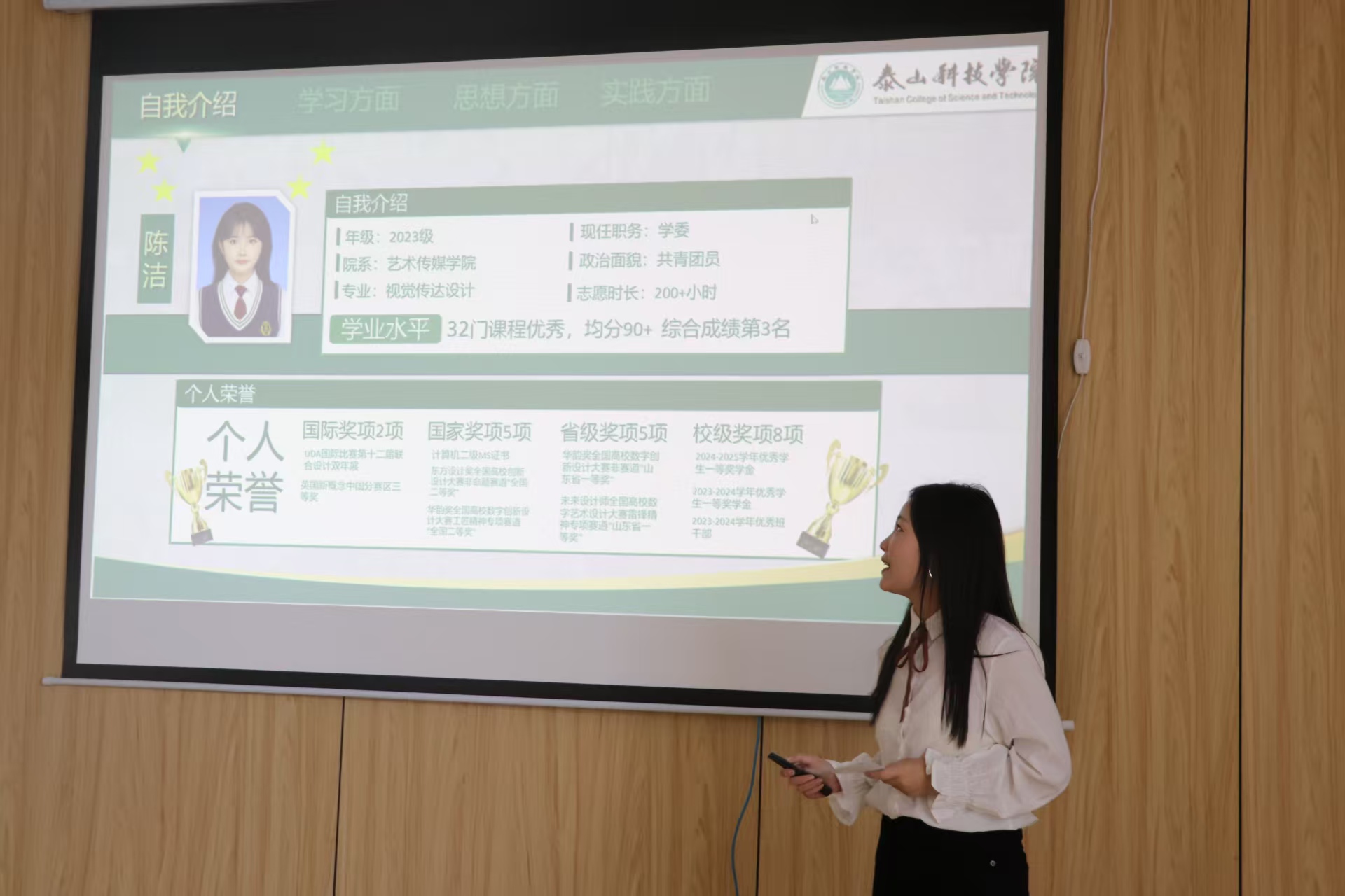 答辩现场,答辩人陈洁以《行而不辍,未来可期》为主题,从多方面展现优秀风采。她思想积极,是入党积极分子。学业上,32门课程获优秀,均分90+,斩获国际奖项2项、国家奖项5项等众多荣誉,《匠心永续 智造未来》系列作品被图书馆永久收藏。学习中她学而不厌,综合成绩稳居班级前5%,获校级一等奖学金,还取得计算机二级MS证书。实践里,她积极组织学习活动、参与社团创建与公益,志愿时长超200小时,获“科技创新先进个人”等称号。从课堂到赛场,从校园到社会,陈洁以“行而不辍”的韧劲,在青春逐梦的征程上不断书写新的芳华,成为学弟学妹们眼中的榜样标杆。