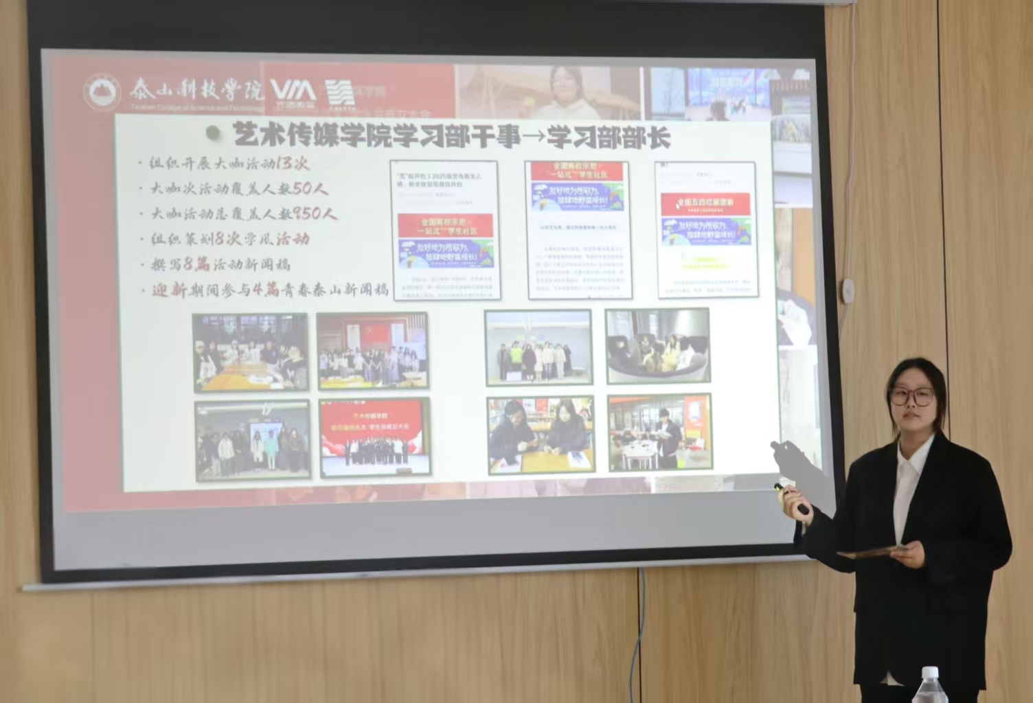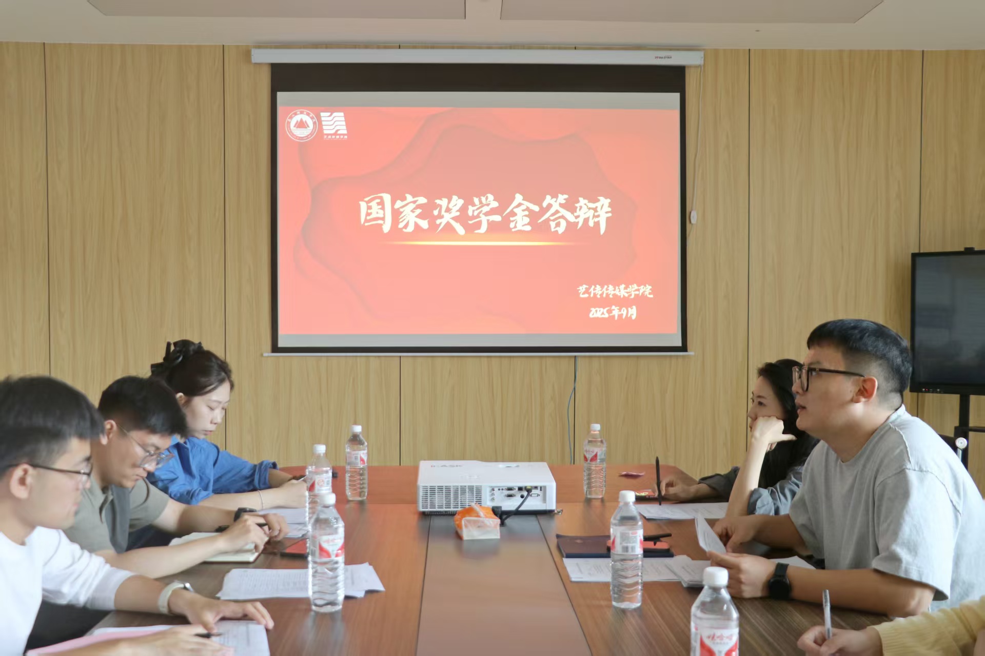 为公平、公正、公开选拔 2024-2025 学年国家奖学金推荐人选,激励全院学生勤奋向学、全面发展。9月28日上午,艺术传媒学院在学院会议室举办国家奖学金本科评审答辩会。学院副院长达世安、团总支书记任子璇,以及辅导员亓迪老师、张海园老师、刘文香老师担任本次答辩会评委,学生工作处彭王益阳老师以及新生辅导员现场观摩。答辩会由张海园老师主持,陈洁、满佳其、李晓雨、张鑫蕊四位候选人按照抽签顺序,依次答辩,展现艺传学子实绩,传播青春拼搏前行朝气。