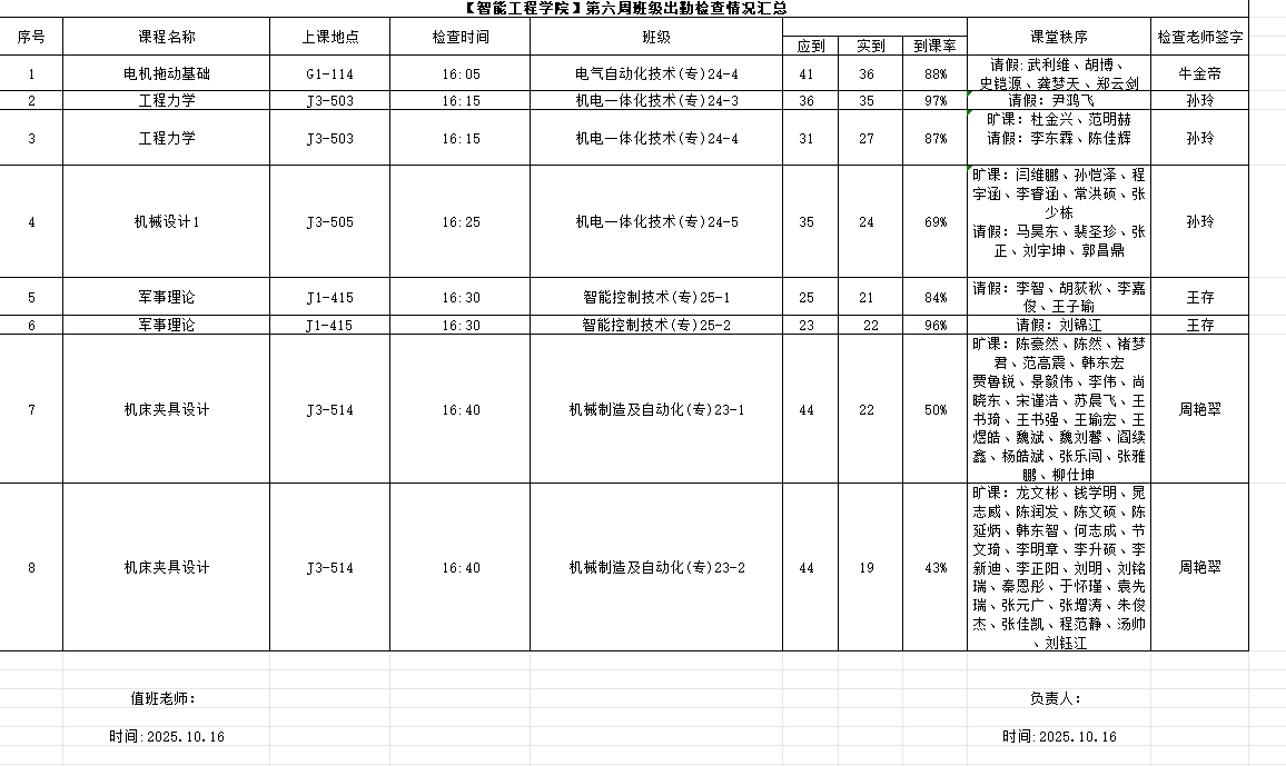 经评比,24、25级专科班级到课率良好,课堂参与度高,学习氛围强,小部分班级存在请假或旷课现象。对此,辅导员已对相应同学进行批评与思想教育。自智能工程学院查课以来,我院对教学质量常抓不懈,学院领导和辅导员深入教学一线开展巡课督察工作,对强化教风学风建设,促进教学质量提高起到重要的推动作用。巡查课堂作为学院教学管理工作中的重要环节,为学院建立良好的教学秩序起到了积极的促进作用。通过此次查课,希望智能工程学院学子能够树立正确的学习态度,积极发挥主观能动性,勤奋学习,在每一天都能精神饱满,奋发图强。
