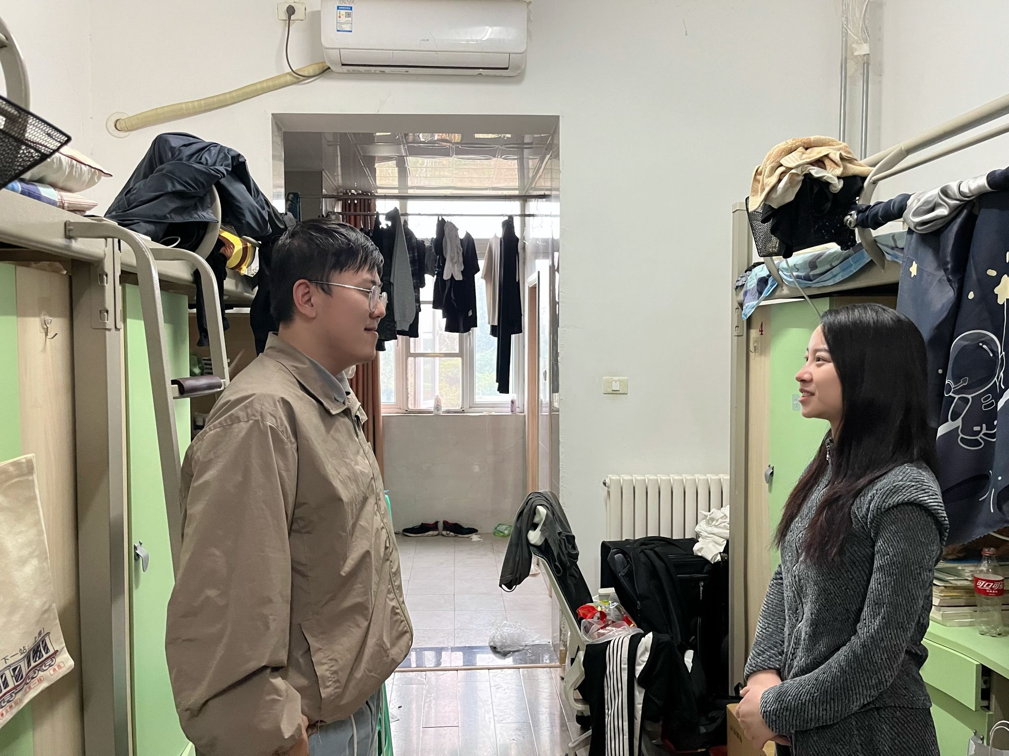 在生活方面,东野圣萍老师对宿舍的用电安全、卫生状况等进行了细致检查,提醒学生注意防火防盗,保持宿舍整洁。东野老师强调:“安全无小事,希望大家共同维护好宿舍环境,为学习和生活创造良好条件。”范克亮老师在走访过程同时关注学生思想动态与心理状态,倾听学生在宿舍人际关系、生活适应等方面的诉求,对学生提出的宿舍设施维修、生活服务优化等问题反馈都一一记录。
