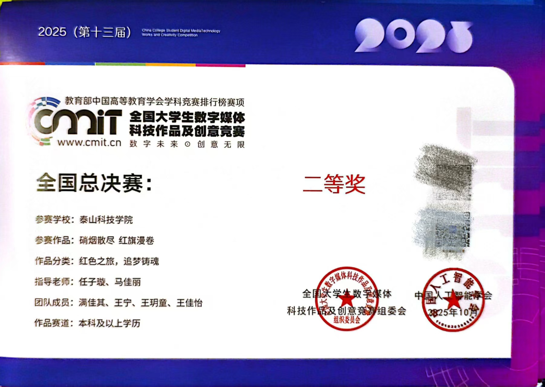 2025年10月24日-10月26日,第十三届全国大学生数字媒体科技作品及创意竞赛全国总决赛在哈尔滨隆重举办。泰山科技学院学子凭借优秀作品《硝烟散尽红旗漫卷》与出色表现,在红色之旅,铸梦追魂赛道成功入围决赛!前往哈尔滨进行决赛评选,作品成功荣获国家级二等奖!这一成绩不仅是对其专业能力的高度肯定,也彰显了学校在数字媒体人才培养领域的扎实成果。