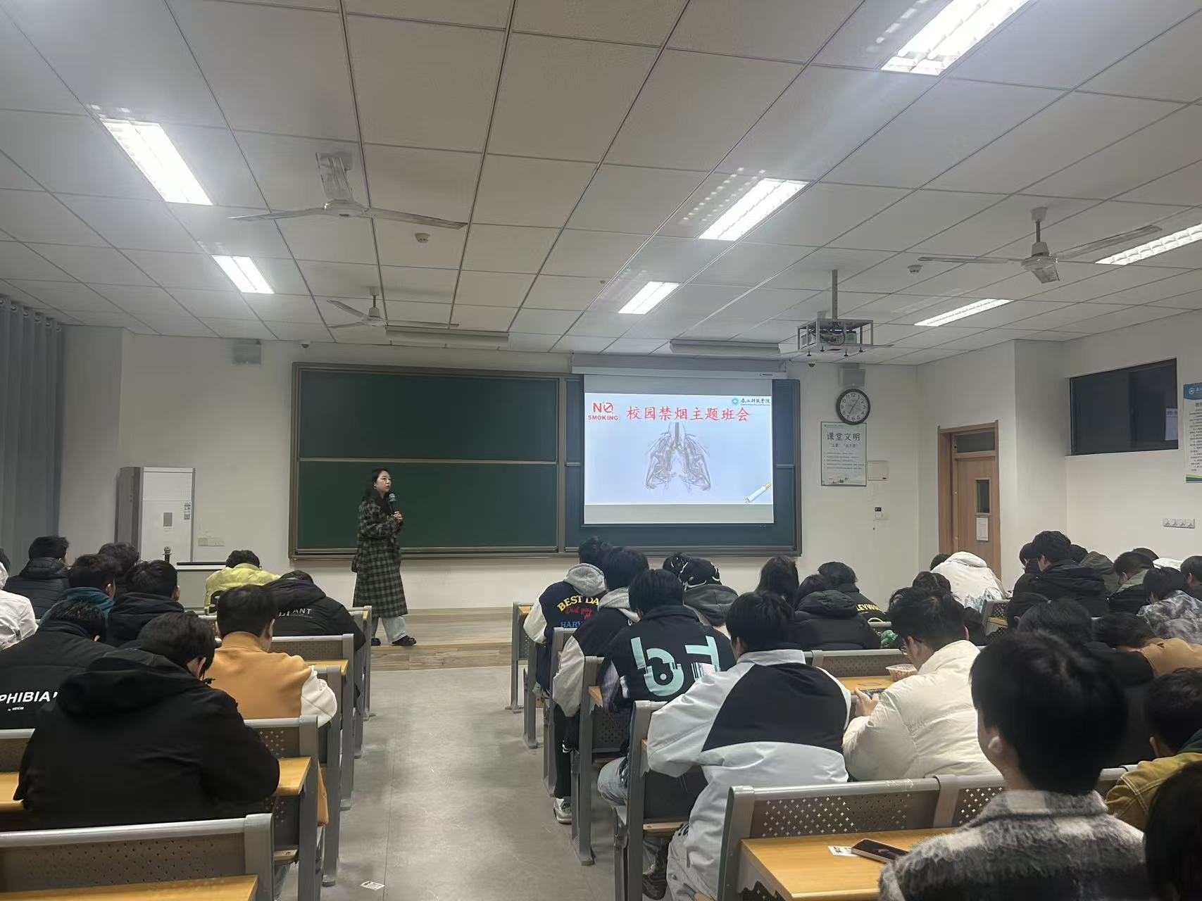 为营造清新、和谐、向上的学习和生活环境,刘安娜老师于周日晚上7:00,在J1-501教室召开“无烟校园,健康生活”主题班会。通过科学数据和真实案例,详细阐述烟草(包括电子烟)对个人健康、校园公共环境及校园消防安全构成的严重威胁,并向全体同学发出“拒绝烟草,从我做起”的倡议,希望同学们强化自律意识,严守校园禁烟规定,不在教学楼、图书馆、宿舍、食堂、体育馆等任何校园室内外公共场所吸烟,做到不吸烟、不递烟、不劝烟,更不随意丢弃烟蒂,用实际行动守护共同的校园空间。