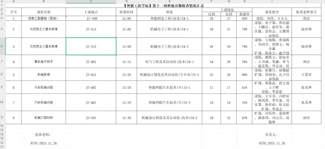 辅导员与任课老师们仔细沟通交流,确保查课的有效性和真实性,切实了解学生们在课堂中的真实状态。本周学风建设课堂检查活动,对智能制造工程(高本)24-1、机械电子工程(高本)24-1、机械电子工程(高本)24-2、电气工程及其自动化(高本)24-1、机械设计制造及其自动化(专升本)25-1、智能网联汽车技术(专)25-1、智能网联汽车技术(专)25-2、机械设计制造及其自动化(高本)24-2、共8个班级进行了检查,具体结果如下: