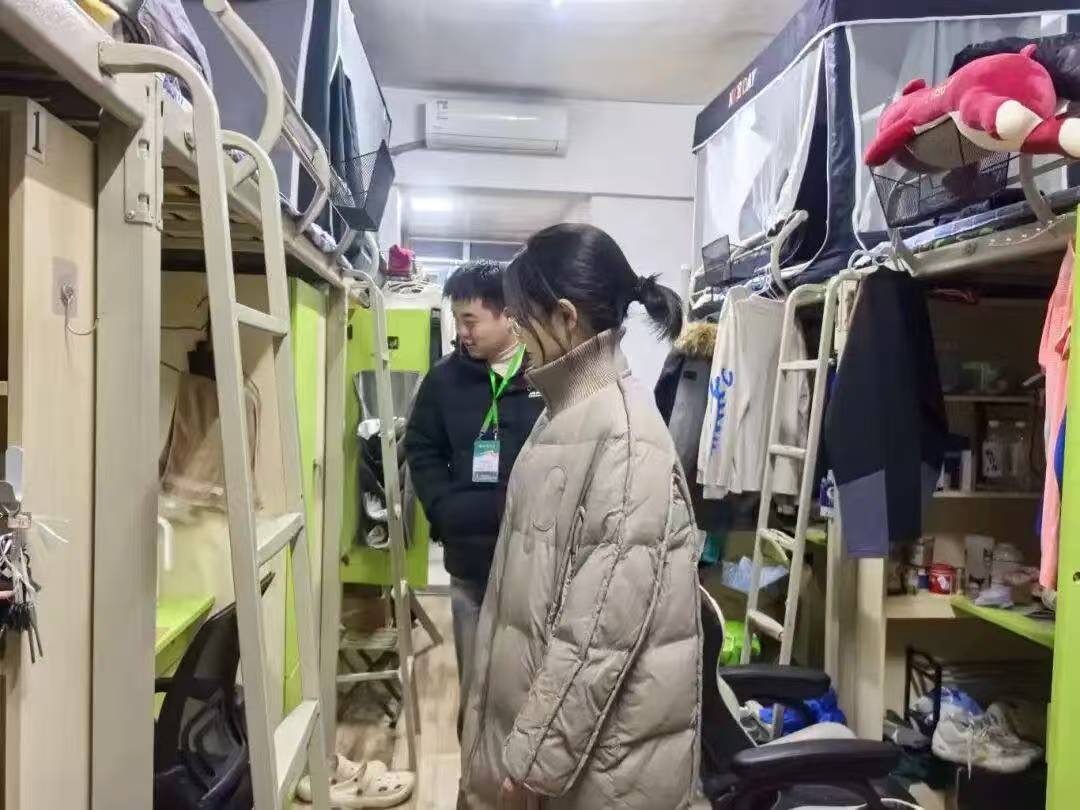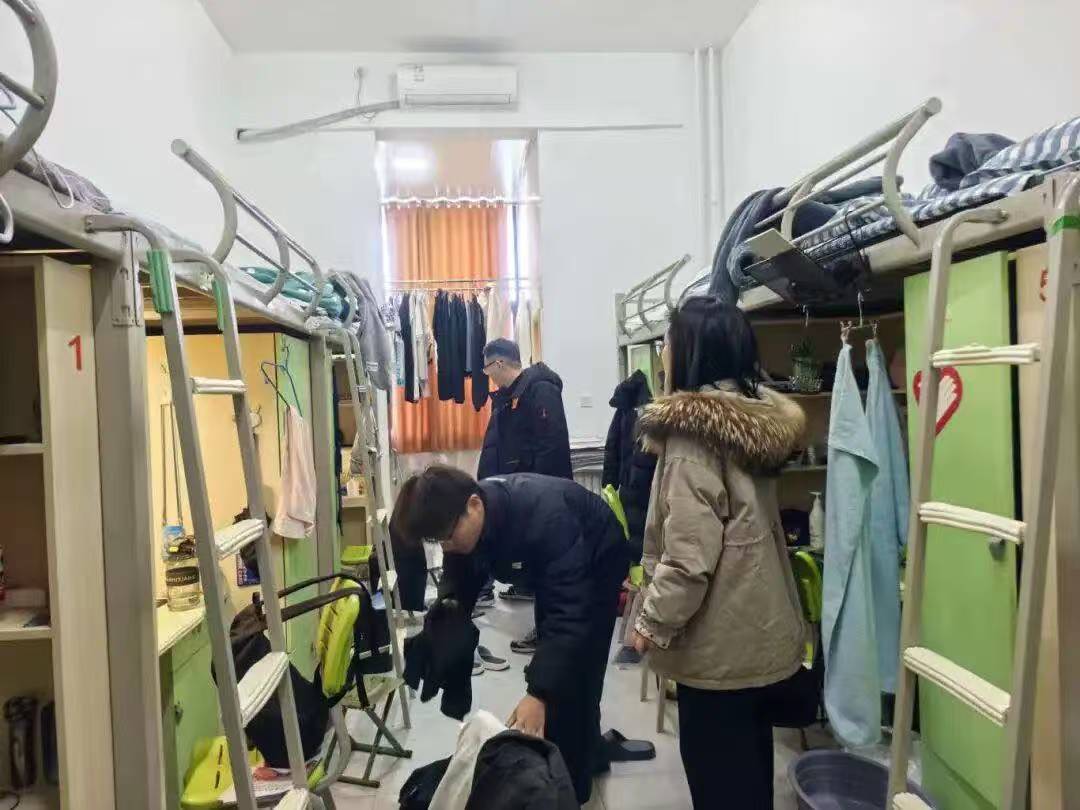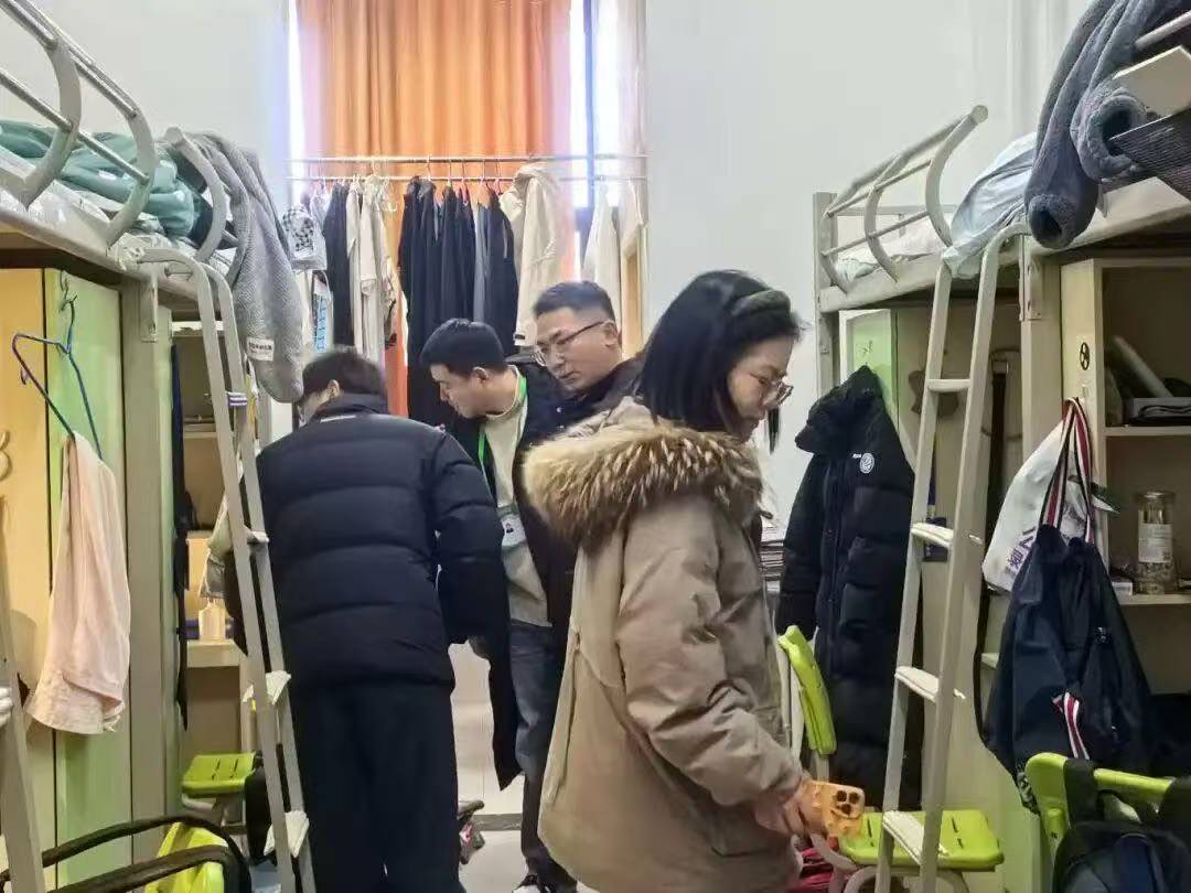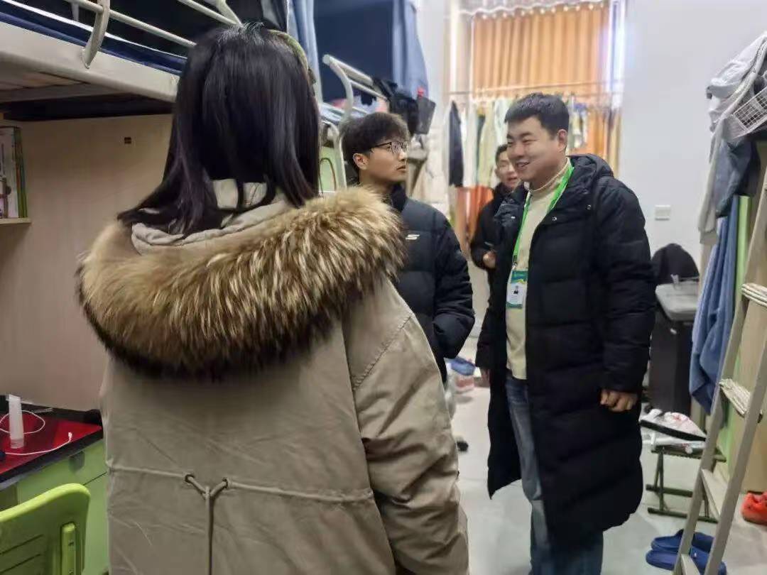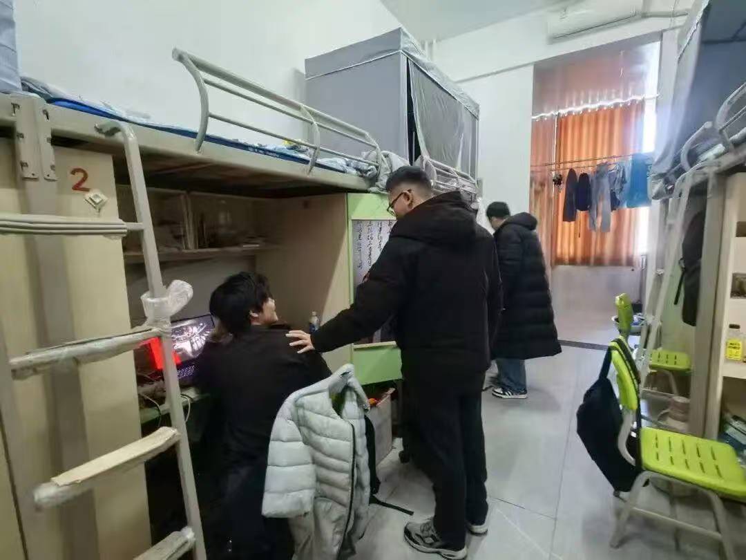 12月15日,检查队伍来到汶阳书院C栋,重点走访了25级远景学生宿舍。这次走访打破了常规检查的框架,成为深入的互动交流。老师们穿梭于各个宿舍,和同学们围坐交谈,细致询问学习生活情况,认真倾听大家关于宿舍生活的困惑与建议。