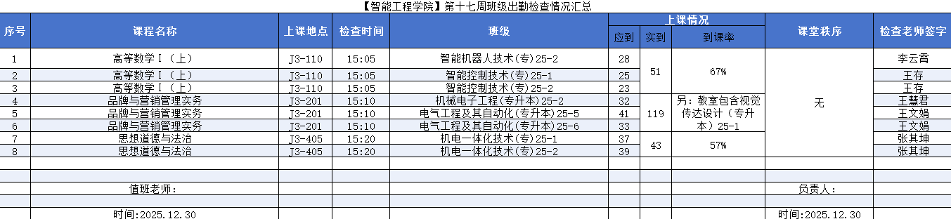 辅导员与任课老师们仔细沟通交流,确保查课的有效性和真实性,切实了解学生们在课堂中的真实状态。本周学风建设课堂检查活动,对智能机器人技术(专)25-2、智能控制技术(专)25-1、智能控制技术(专)25-2、机械电子工程(专升本)25-2、电气工程及其自动化(专升本)25-5、电气工程及其自动化(专升本)25-6、机电一体化技术(专)25-1、机电一体化技术(专)25-2共8个班级进行了检查,具体结果如下: