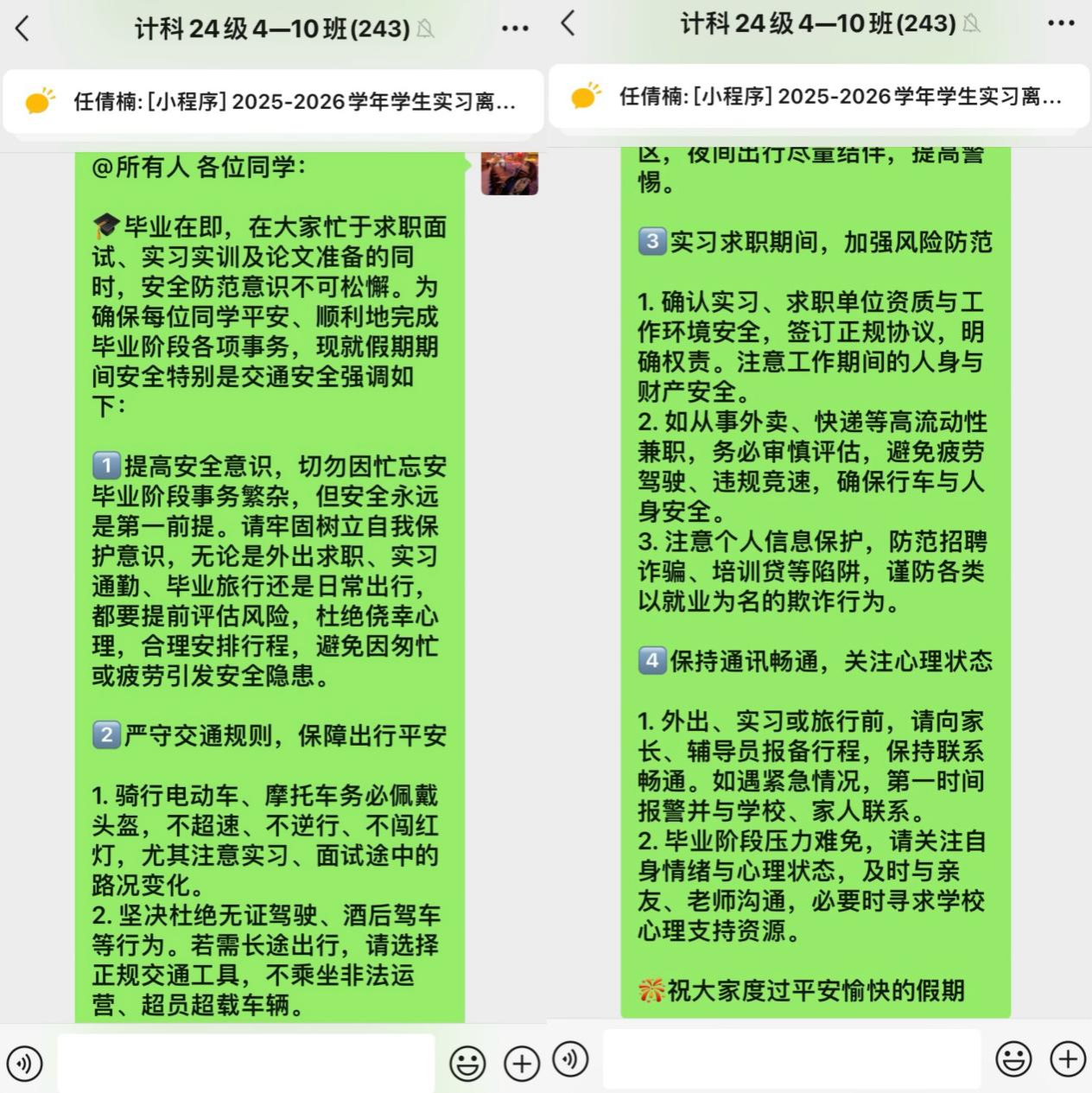 为确保安全教育全覆盖、无死角,学院通过腾讯会议开展线上专题班会,结合真实案例深度解读安全规范;依托班级群持续推送详实的安全提醒与应急处置流程;针对毕业生、实习学生等重点群体,开展一对一沟通,摸排外出与兼职情况,建立动态联系机制,反复叮嘱学生外出前向家长与辅导员报备行程,保持通讯畅通,遇紧急情况第一时间报警求助。