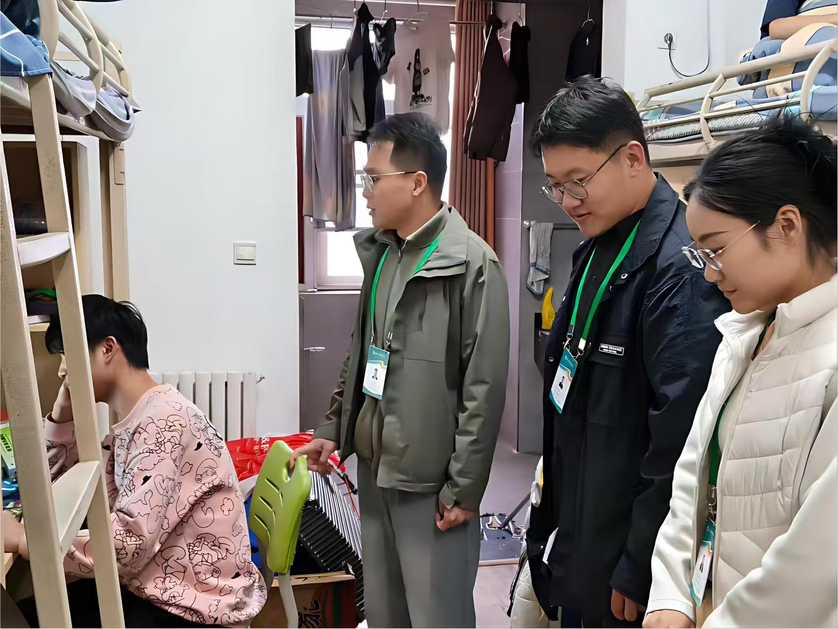 为进一步加强学生宿舍管理,筑牢校园安全防线,营造整洁、文明、安全、和谐的住宿环境,切实掌握同学们的学习生活状态。4月8日,通信工程学院各位辅导员在副院长宋宏越老师的带领下,深入瞻岩书院学生宿舍,开展第54期常态化宿舍安全卫生专项检查工作。本次活动以实地走访、面对面交流的方式,将管理与服务、教育与关怀送到同学们身边,旨在通过细致排查与暖心互动,帮助学生提升安全意识、养成良好卫生习惯,构建更加温馨有序的宿舍氛围。