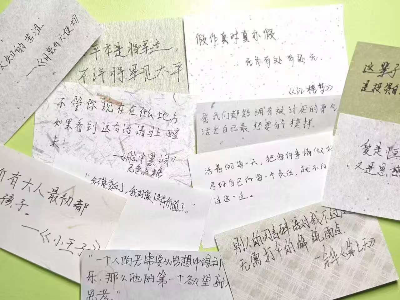 在本次活动的最后环节,经过三位学长的分享,我们回望了旧社会的苦难图景,感受了那段历史中人们所承受的压迫与挣扎;也共同经历了新思潮的激荡洗礼,体会了思想觉醒带来的力量与希望。我们开始思考“自我”在历史与当下的坐标中究竟意味着什么。除了学长们分享的好书,我们也为同学们准备了许多经典好书,我们相信每名同学都能够从书中找到喜欢的一句话,请同学们将那句话分享出来。让我们以笔为媒,以书为桥,在彼此写下的一句话中,看见更多人生的风景,也让他人看见你的世界。