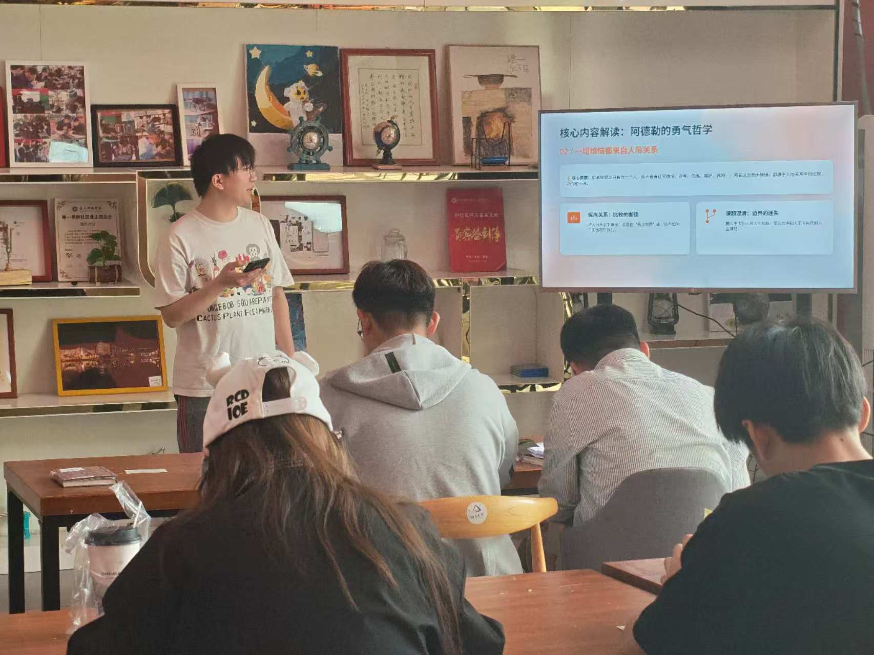 最后,李华霖学长分享了《被讨厌的勇气》,一场关于“自我启发之父”阿德勒的哲学课。与前两位学长的分享不同,李华霖学长的推荐理由更加浅显易懂——解决真实的烦恼。“这本书一针见血地指出了我们内心深处最普遍的困扰。无论是感到自卑、焦虑还是孤独,其根源都与我们如何看待自己、以及如何与他人相处息息相关。” 李华霖学长说“我们并非被过去束缚,而是主动选择了生活”学长真挚的分享了他对这本书的所有感悟,在最后,学长祝福我们都能拥有被讨厌的勇气,去活出自己想要的模样。