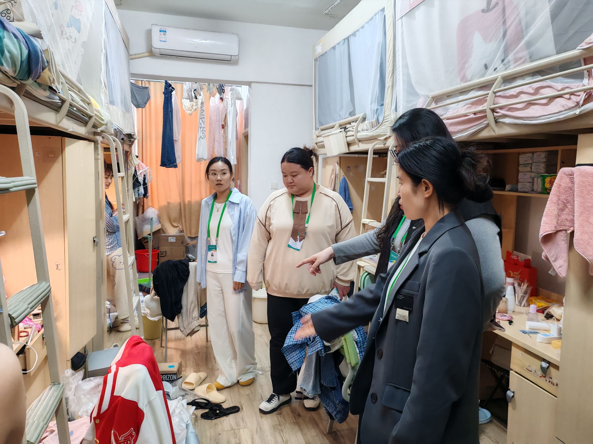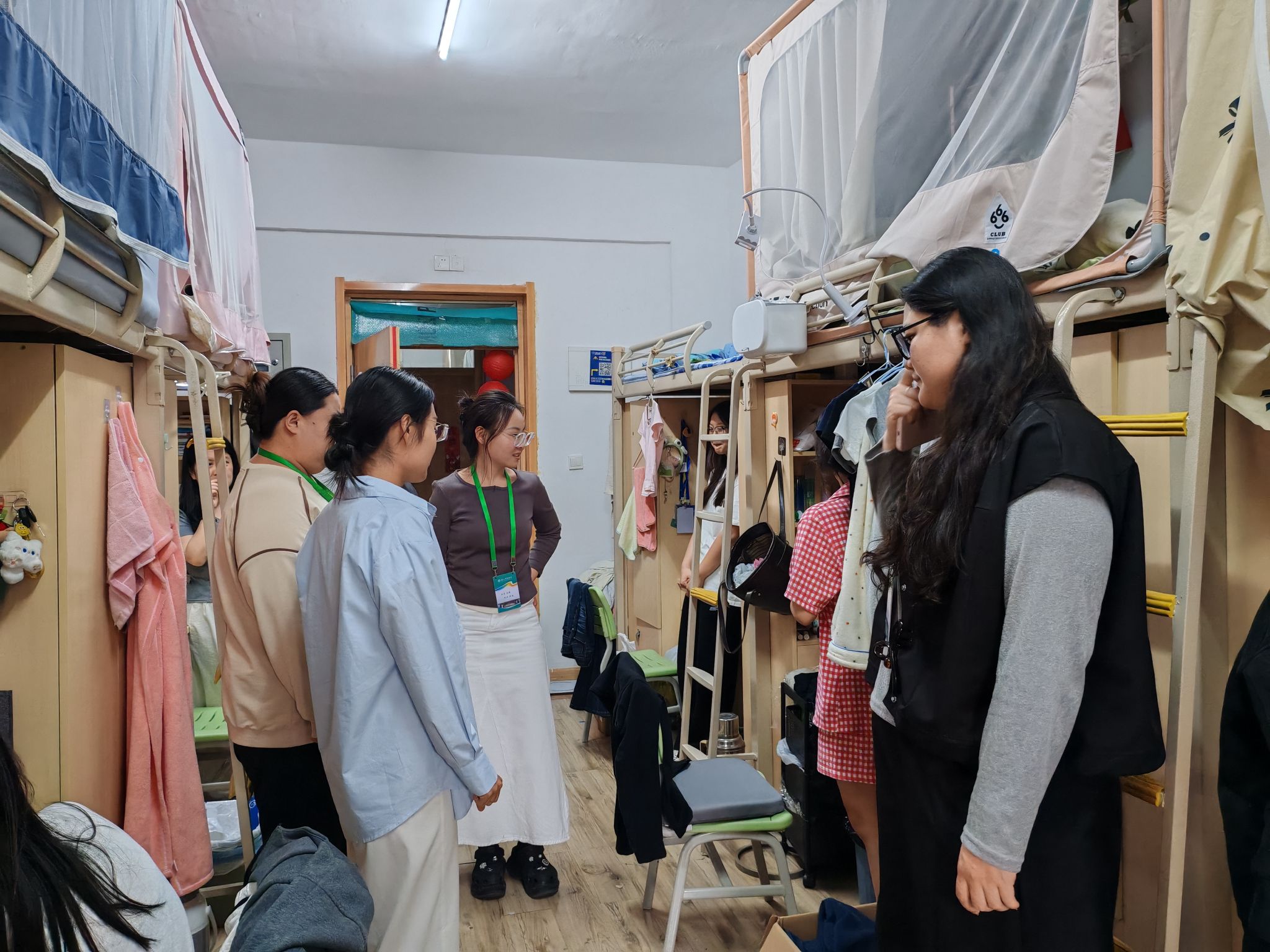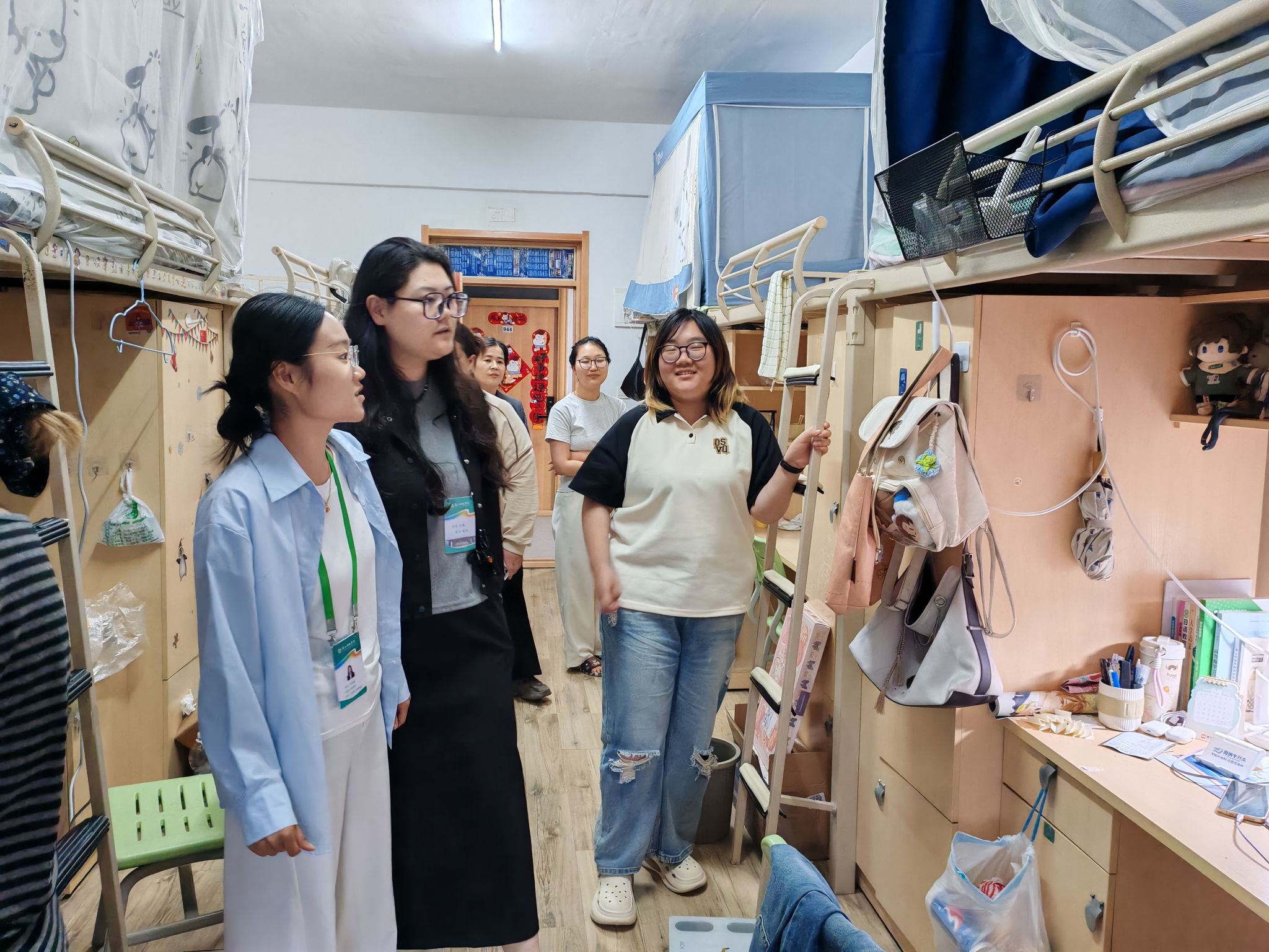 走访中,老师们借机向同学们介绍了第四届宿舍文化节活动,鼓励大家以宿舍为单位踊跃参与,通过共同布置、创意比拼和团队协作,进一步增进室友感情,营造积极向上的宿舍文化氛围。同时建议大家不妨结合各自特长,比如擅长绘画的同学设计宿舍门牌,喜欢摄影的同学参与短视频赛道,让每个人都能在活动中找到属于自己的舞台。临走前,老师们鼓励同学们不仅要保持踏实自律的学风,更要通过文化节的平台,把宿舍建设成充满温度与创意的“第二家园”。